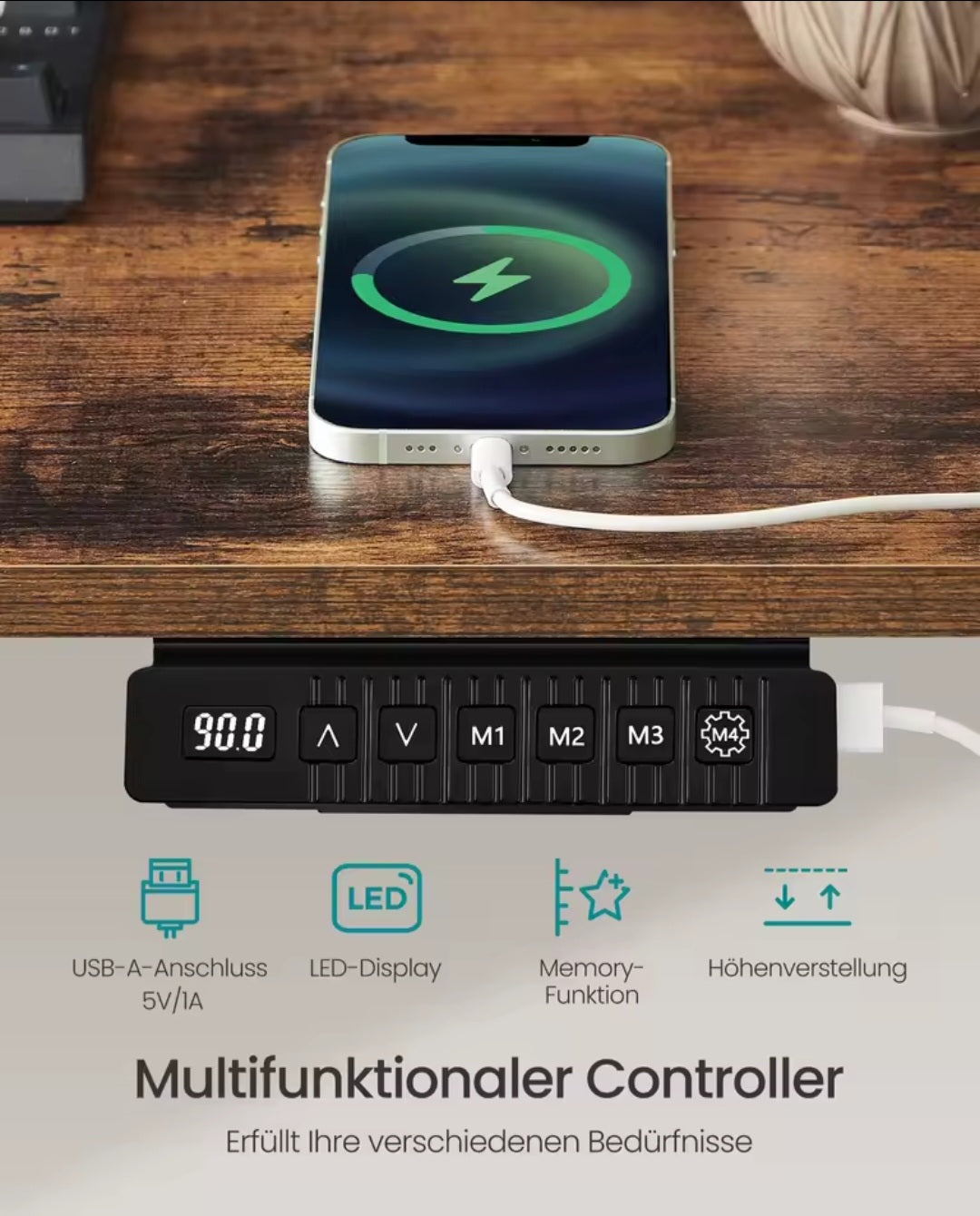 4 opbergknoppen en bescherming aan de achterkant. U kunt de hoogte van het elektrische bureau aanpassen tussen 72 en 120 cm in 4 gewenste hoogtes.